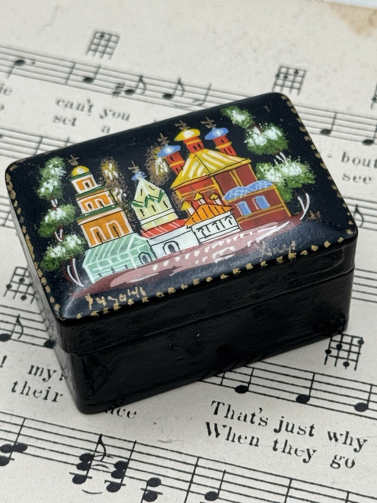 Vintage Russian Style Hand Painted Trinket Box SIGNED 2.25” X 1.5” X 1.25”