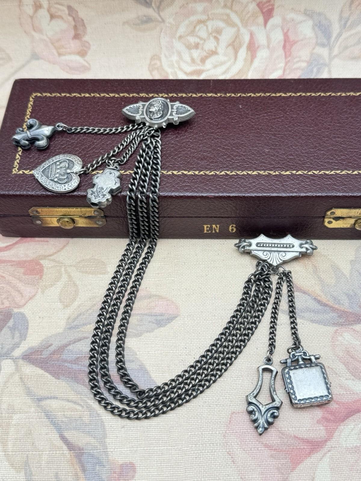 Beautiful vintage Victorian Revival chatelaine-style brooch guard featuring multiple dangling chains and ornate charms. This double brooch is linked with three cascading chains and finished with highly detailed charms in classic motifs.