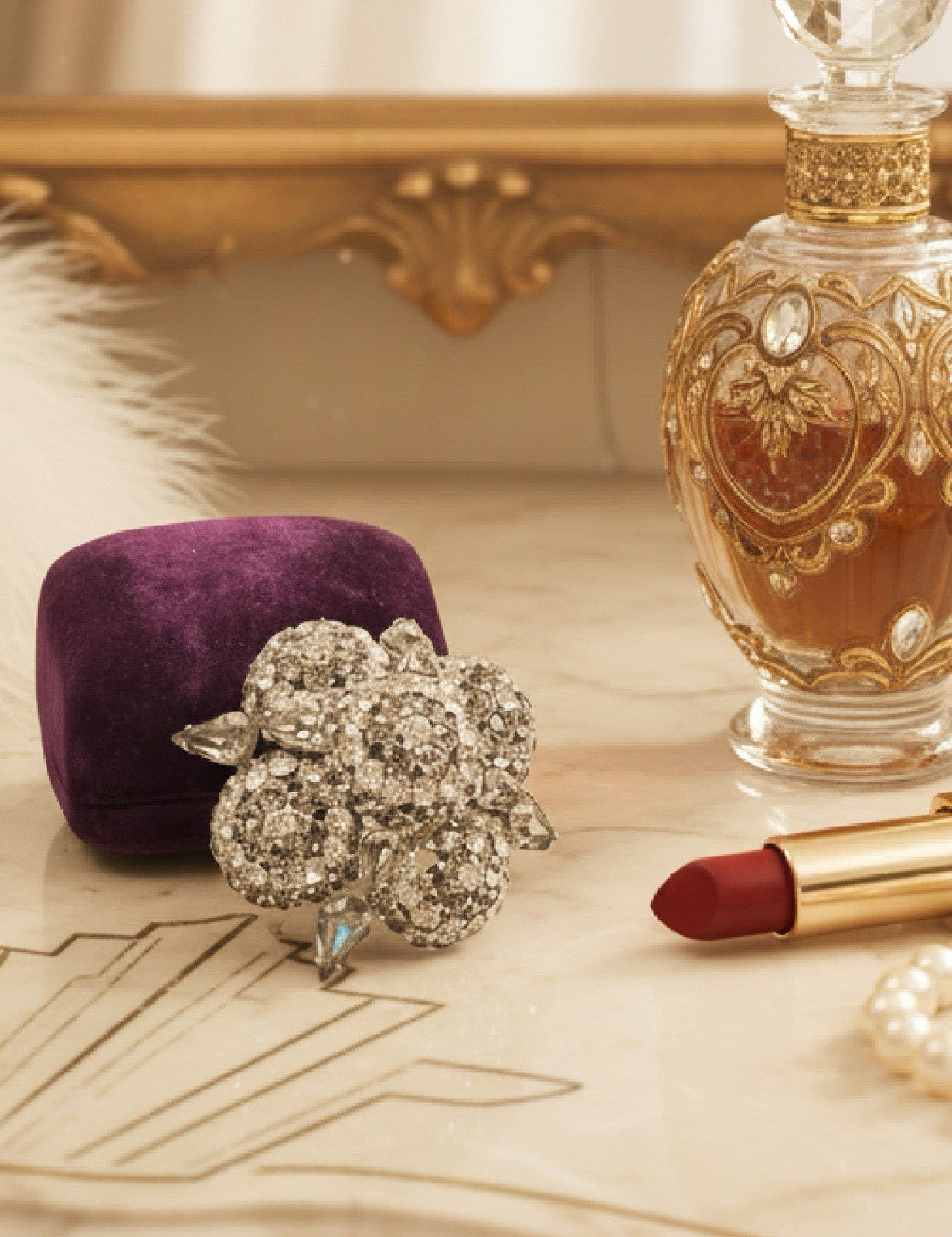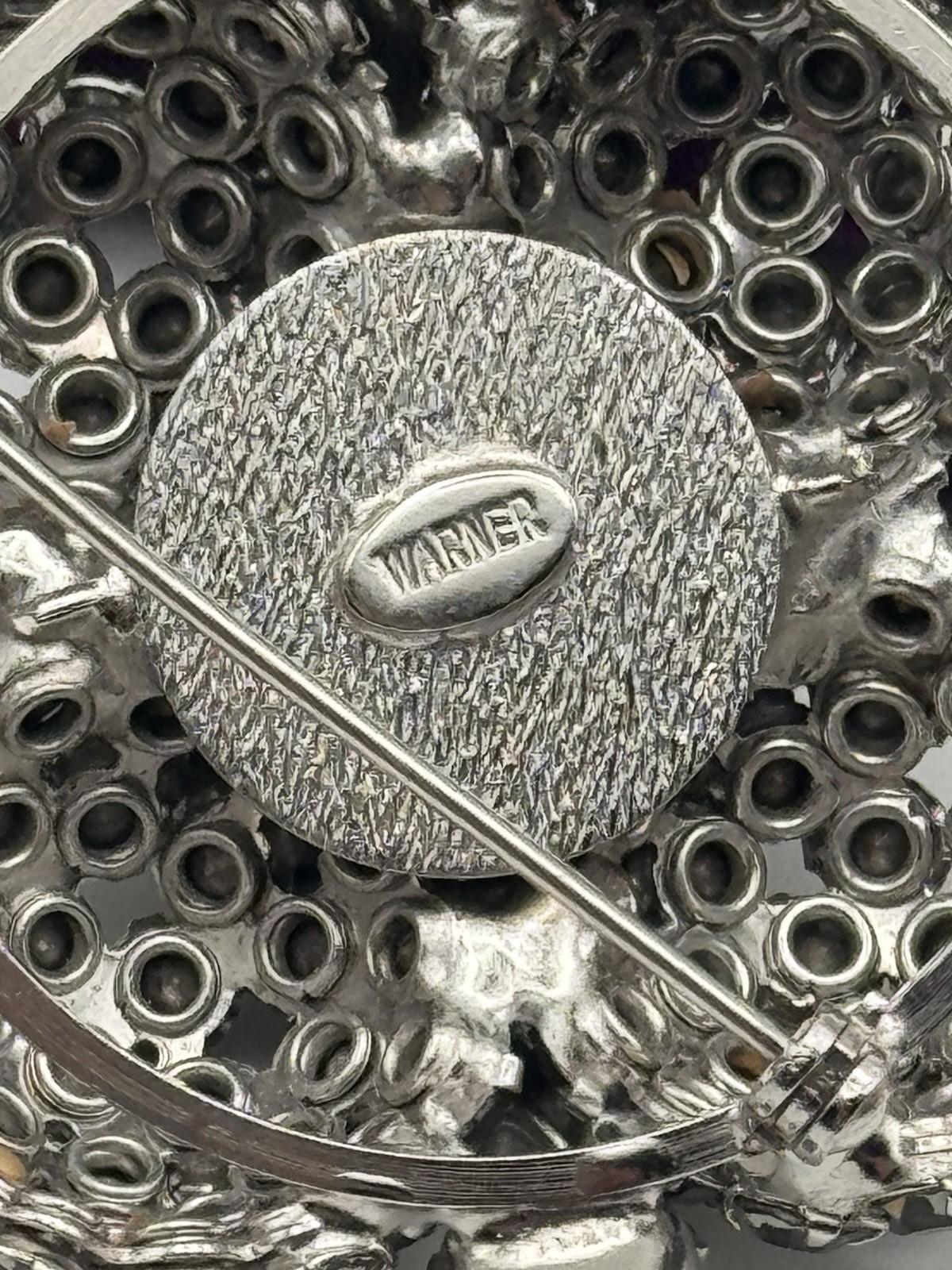 Founded by Joseph Warner, the firm produced high-quality American costume jewelry noted for dense pavé work, layered construction, and excellent rhodium or japanned plating. Pieces are almost always signed “WARNER” (often in an oval cartouche). Warner favored premium Austrian rhinestones—clear, aurora borealis, and the brand’s coveted smoky “black-diamond” palette—plus domed clusters, florals, starbursts, and holiday pins (their Christmas trees are especially collected). Production was relatively limited compared with bigger houses, so intact examples with original stones and bright plating remain desirable with vintage jewelry collectors today.