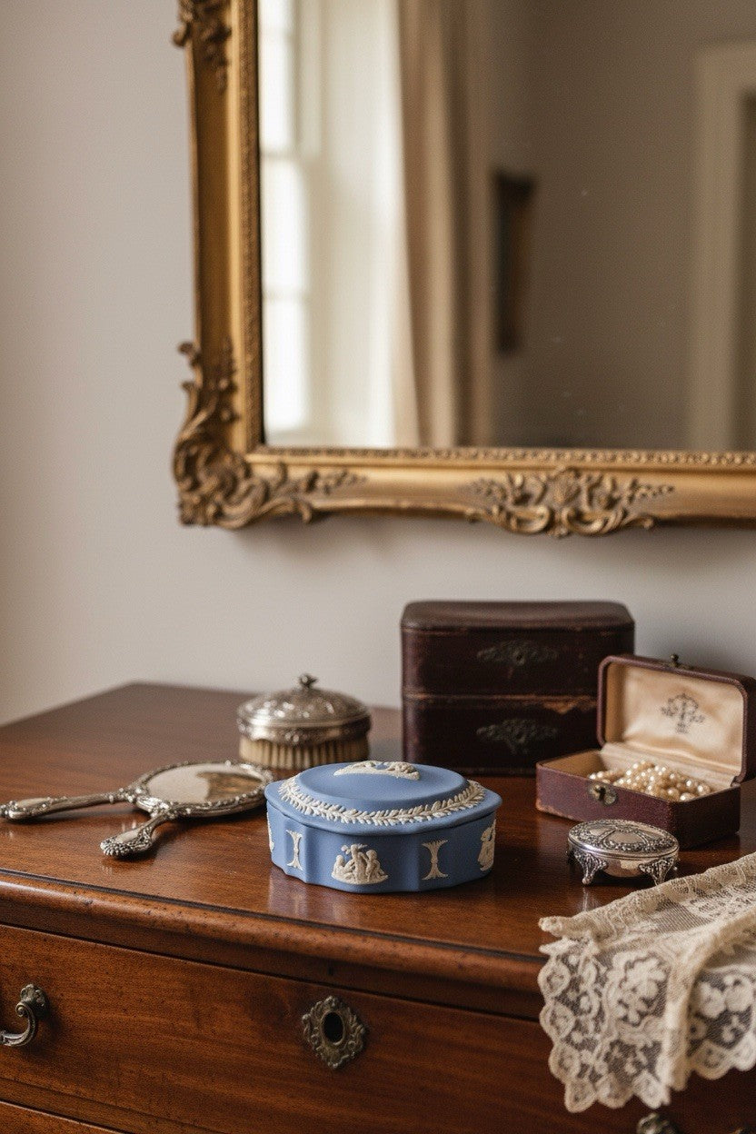 A timeless Wedgwood jasperware trinket box in the iconic powder blue and white relief that collectors instantly recognize.